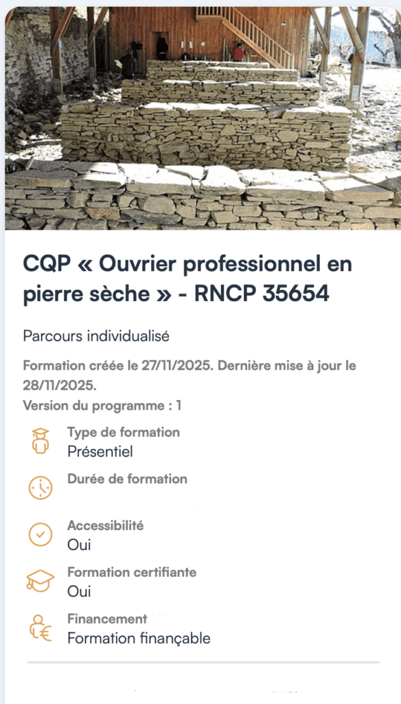 - Se préparer à l’épreuve du CQP Ouvrier professionnel en pierre sèche ; examen en fin de parcours des 2 blocs de compètences